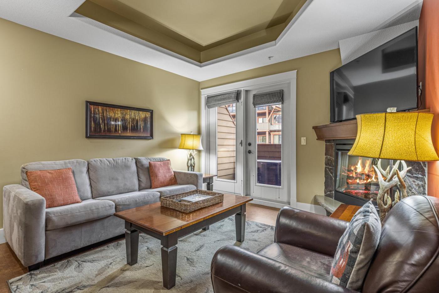 Two-Bedroom Apartment. The hot tub and fireplace are the special features of this apartment. This spacious apartment comes with 1 living room, 2 separate bedrooms and 2 bathrooms with a bath and free toiletries. Guests will find a stovetop, a refrigerator, a dishwasher and kitchenware in the kitchen. The apartment also includes a barbecue. This air-conditioned apartment includes a dining area, a flat-screen TV with streaming services a washing machine and a patio. The unit has 3 beds.