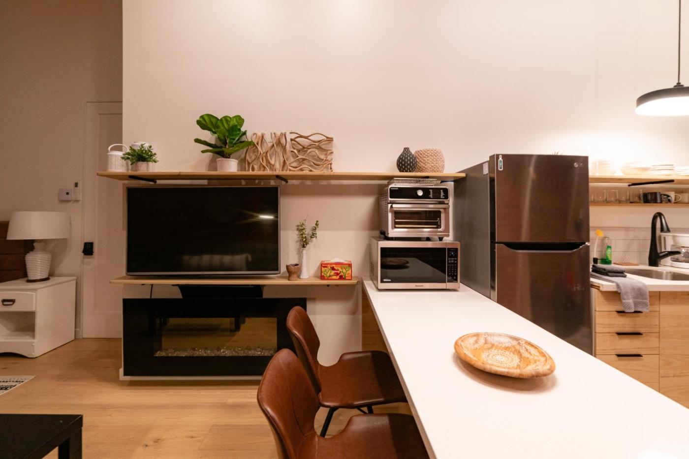 Queen Studio. This studios special feature is the fireplace. Guests will find a refrigerator, a dishwasher, an oven and a microwave in the well-equipped kitchen. The studio also offers a barbecue. The studio provides air conditioning, a washing machine, as well as a private bathroom featuring a bath and a hairdryer. The unit offers 1 bed and 1 futon.