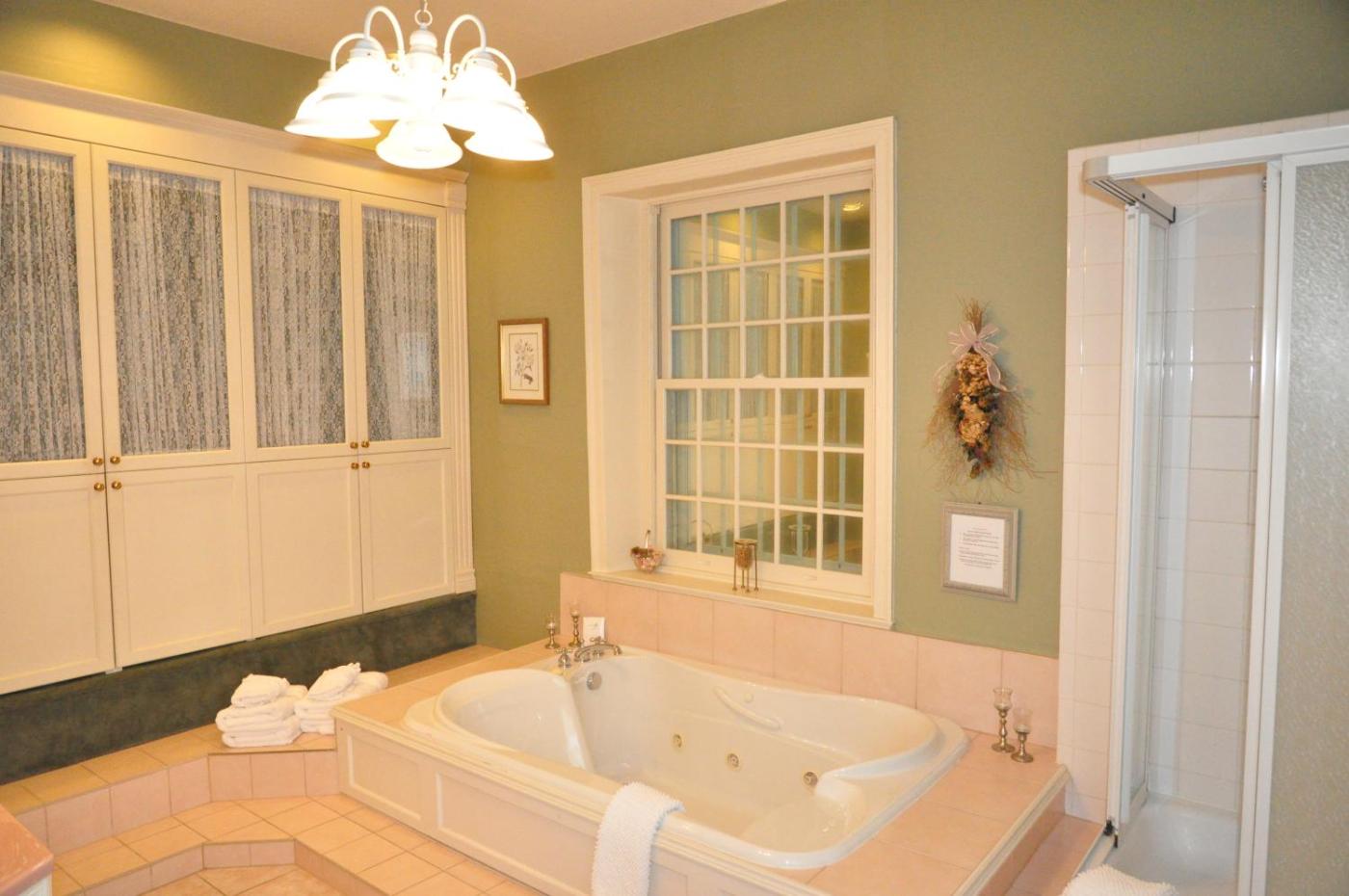 King Room - Cousin Amelia. This bright, 2nd floor room has windows overlooking the garden. It features a king size bed, antique furniture and a gas fireplace. The private en suite bathroom contains a clawfoot soaker tub and separate walk-in shower. ;