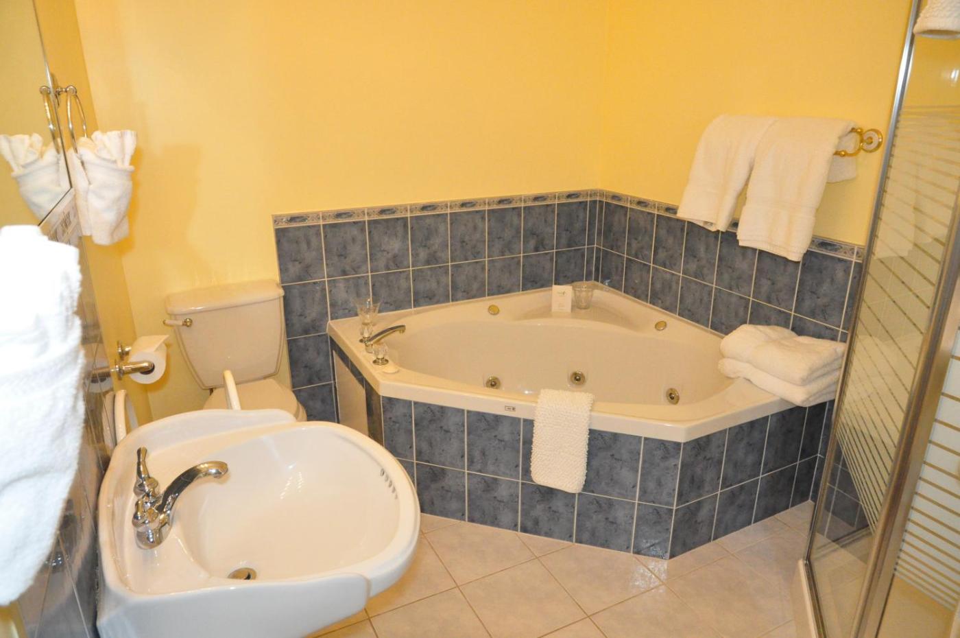 Deluxe King Room - Lady Sophia. With an English country-style décor, this room offers a seating area, gas fireplace, LCD cable TV and DVD player. The en suite bathroom enjoys a spa bath and heated tiled floors.