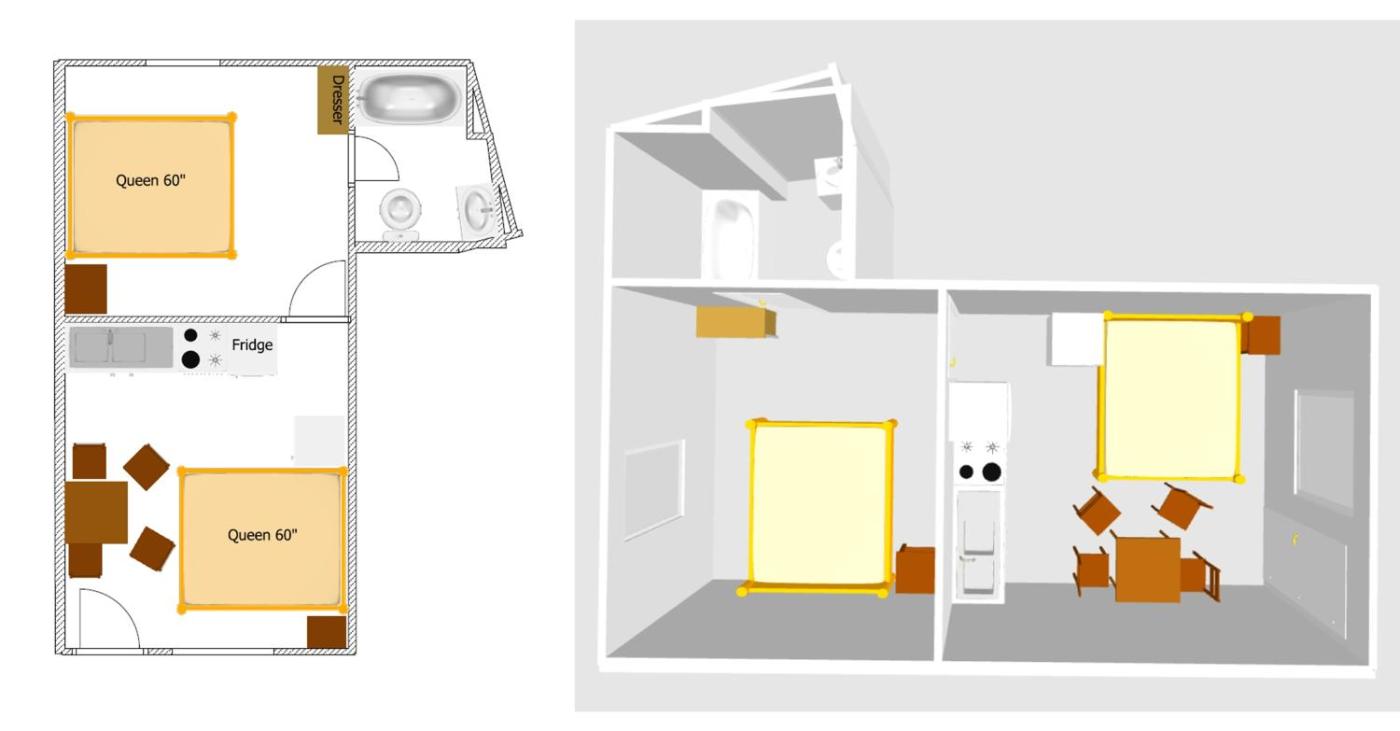 Deluxe Queen Room with Two Queen Beds. In the well-fitted kitchen, guests will find a stovetop, a refrigerator, kitchenware and a microwave. This air-conditioned quadruple room is comprised of a flat-screen TV with streaming services, a private bathroom as well as a terrace with mountain views. The unit has 2 beds. ;