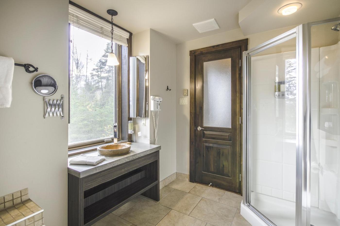 The rustic guest rooms at Auberge du Lac Taureau et Condos, Origine Artisans Hôtelier include stained hardwood flooring and a marble bathroom. A cable TV, free WiFi and a coffee maker are provided in each room.
