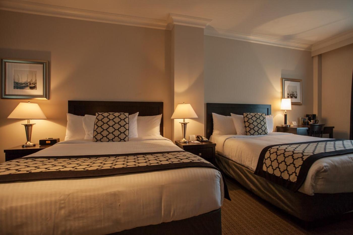 Queen Room with Two Queen Beds. Modern room with 40-inch flat-screen TV and bathrobes. ;