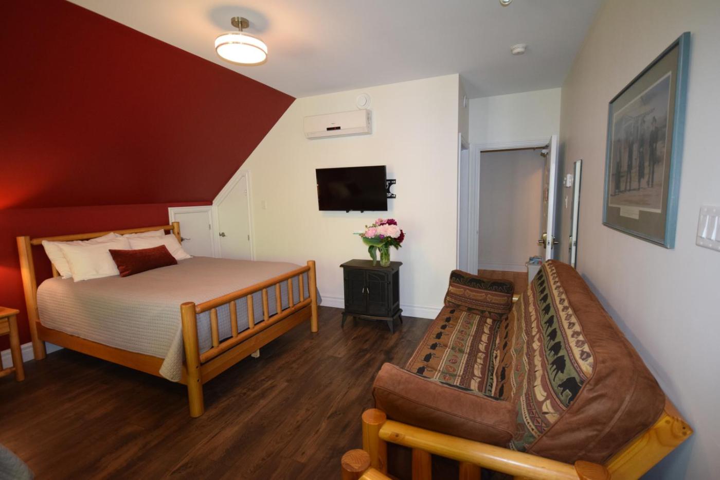 King Suite with Spa Bath. The hot tub and fireplace are the standout features of this suite. Featuring a private entrance, this air-conditioned suite consists of a kitchen, 1 bedroom and 1 bathroom with a bath and a shower. The fully equipped kitchen has a stovetop, a refrigerator, kitchenware and an oven. This suite features soundproof walls, flat-screen TV with streaming services, mountain views, as well as chocolate for guests. The unit offers 1 bed. ;